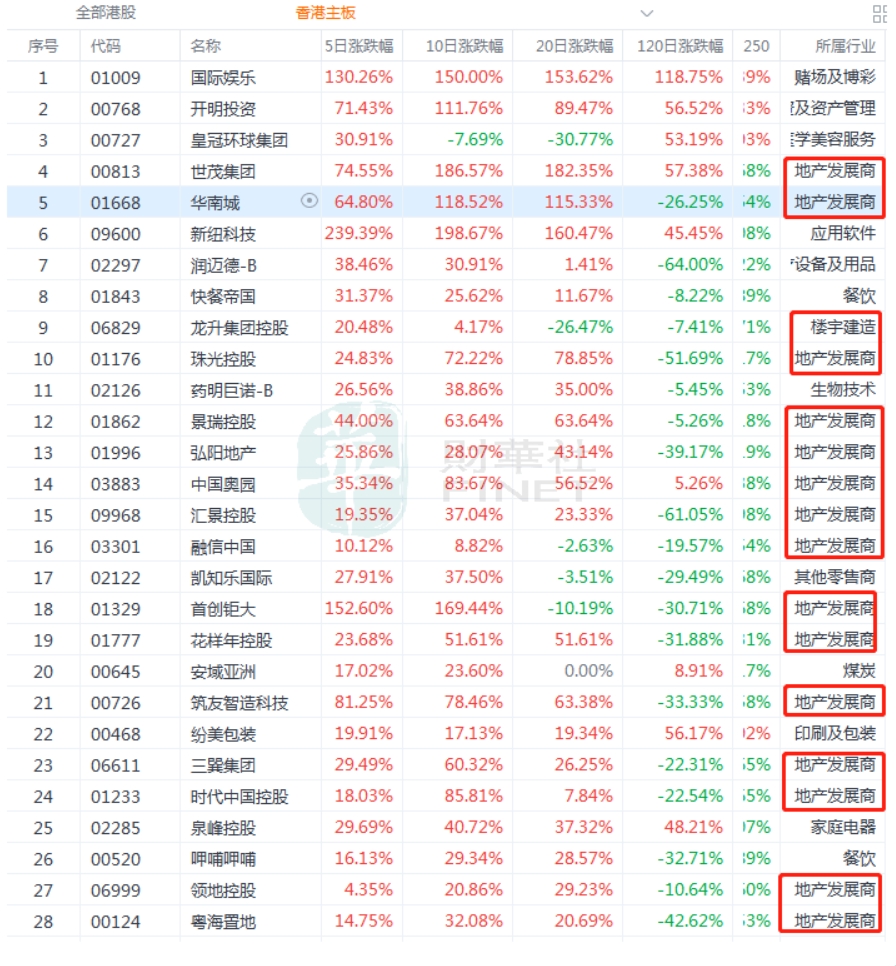 值得关注的是,港股今日地产股“霸屏”,涨幅前28只个股中,共有16只地产相关个股,占比接近六成,实属“罕见”。