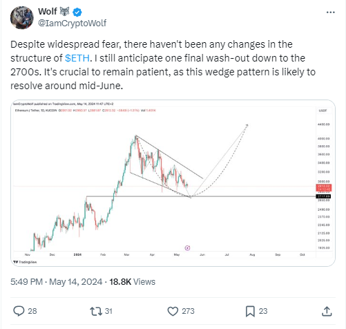 一位分析师在 X 平台上指出,代币仍然看跌,并在下降楔形内移动。该交易员预测 ETH 将继续跌破当前支撑位。