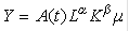 式中 Y 是工业总产值,At 是综合技术水平,L 是投入的劳动力数(单位是万人或人),K 是投入的资本,一般指固定资产净值(单位是亿元或万元,但必须与劳动力数的单位相对应,如劳动力用万人作单位,固定资产净值就用亿元作单位),α 是劳动力产出的弹性系数,β 是资本产出的弹性系数,μ 表示随机干扰的影响,μ≤1。