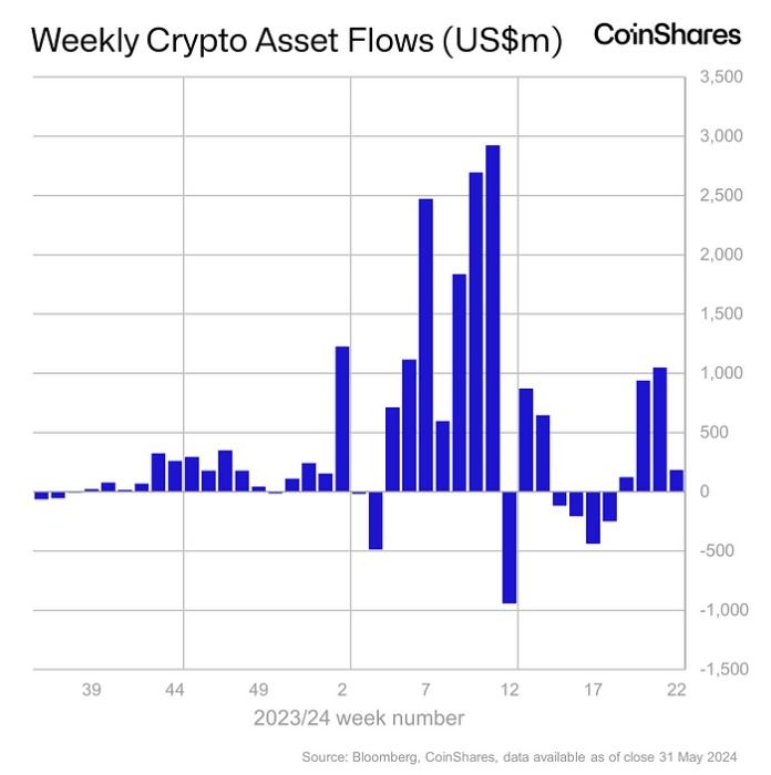 数字资产的投资前景继续明朗,连续第四周流入总额为1.85亿美元,使5月份的总流入达到了令人印象深刻的20亿美元。最新的 Coinshares 流入报告显示,今年迄今为止,流入的资金已推动投资额超过150亿美元的门槛。