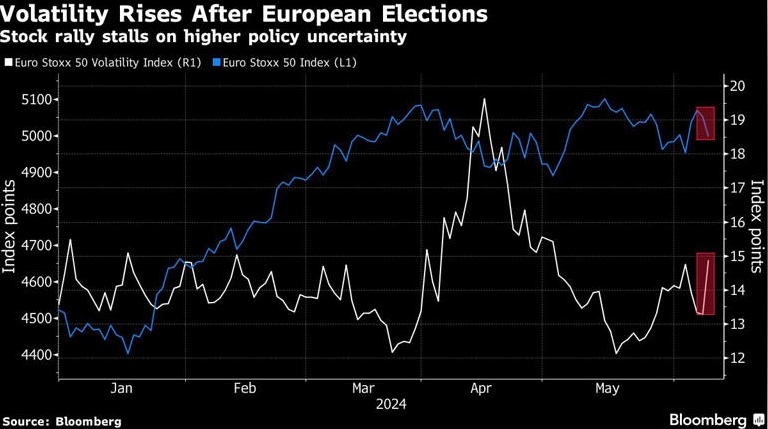 图:欧洲选举后波动性上升|股市上涨因政策不确定性增加而停滞 来源:Bloomberg