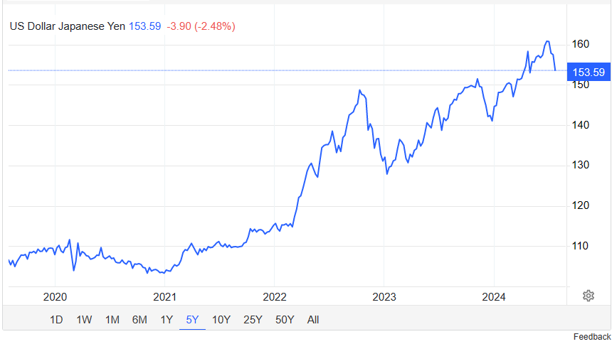 自2022年美联储大幅加息抗通胀以来,日元出现史诗级别的贬值,因为日本央行一直按兵不动。2022年秋季,日元跌破150日元关口以后,贬值趋势加速,2024年7月日元跌破161关口。