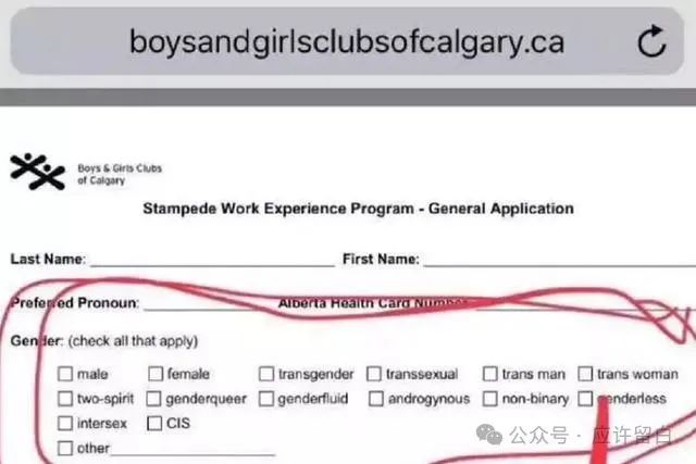 这是卡尔加里的一个少年俱乐部申请表,在 Gender 性别这一栏目,总共性别种类是13种。与此相比,奥运会的 LGBTQ 已经算小儿科了。