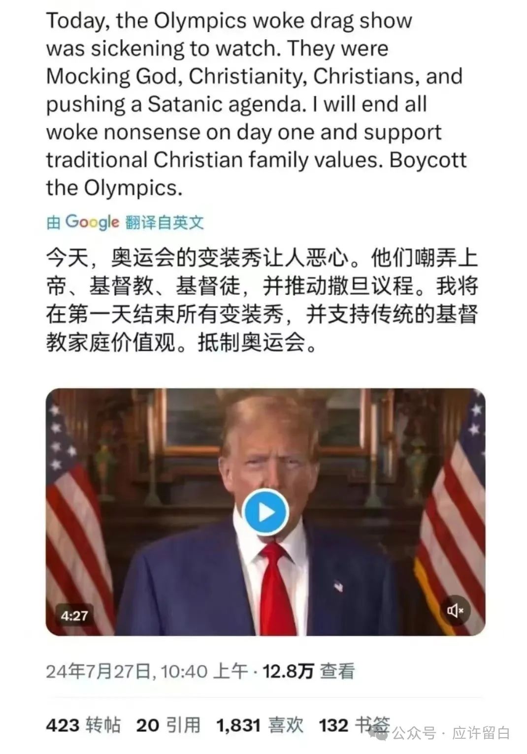 所以,身为共和党候选的特朗普必须争取传统保守派的支持,所以借奥运会,要传播正统基督教文化。在此之前,LGBTQ 的浪潮已经几乎是政治正确。但川普这次就把箭头指向了这些,誓要恢复传统文化。