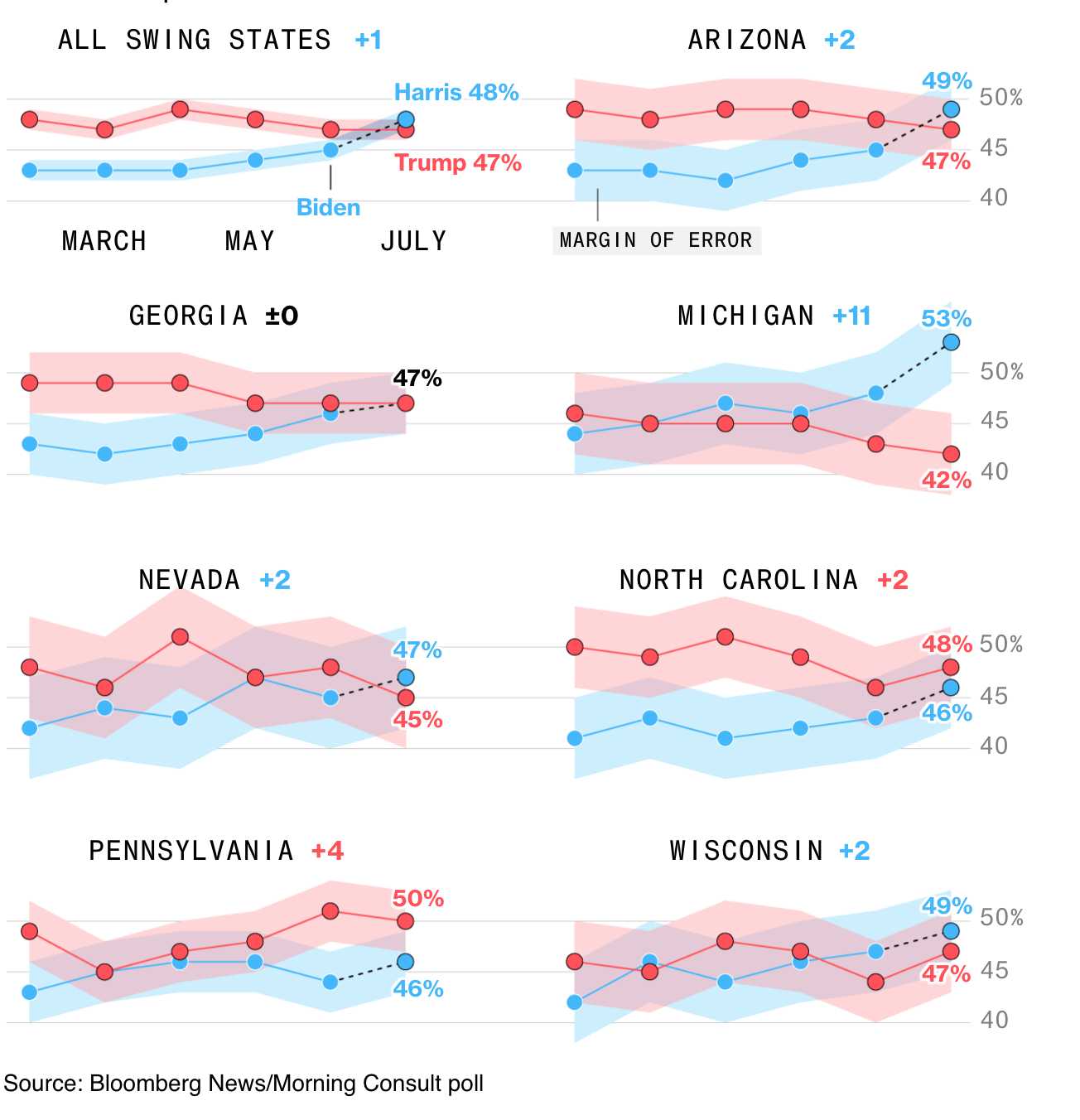 但是,最新的彭博/Morning Consult的民调数据显示,哈里斯(贺锦丽)在七个摇摆州已经追上了特朗普。
