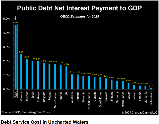 全球宏观资产管理公司Crescat指出,全世界没有一个经济体像美国一样承受着来自债务维持成本的压力。鉴于债务成本激增,人们有理由质疑美国经济能否继续维持这种水平的财政主导地位,尤其是与其他国家相比。