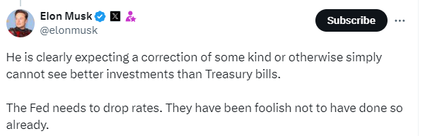 值得注意的是,特斯拉 CEO 马斯克在巴菲特减持苹果股票的消息后,借机抨击了美联储。马斯克在社交媒体上表示,巴菲特的举动显然预示了某种形式的市场回调,或者他仅仅认为没有比美国国库券更好的投资了。马斯克进一步批评称,美联储需要降息,而他们迟迟未行动是“愚蠢的”。