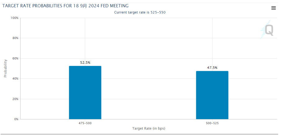 芝商所的美联储观察工具显示,利率期货市场交易员目前预计美联储9月降息50个基点的概率约为52%,降息25个基点的概率为48%,PPI数据公布之前这组对比为完全“五五开”(50对50)。