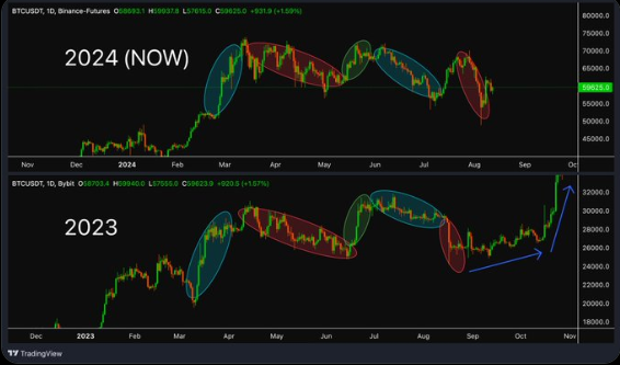对于比特币后市走势,知名加密货币分析师迈尔斯-多伊彻(Miles Deutscher)指出,比特币目前的价格走势与去年的走势相似。当时,比特币在 8 月份的一次大规模去杠杆潮中从其区间顶部的 30000 美元跌至 24000 美元,随后2个月维持横盘走势,直到 10 月份开始反弹。