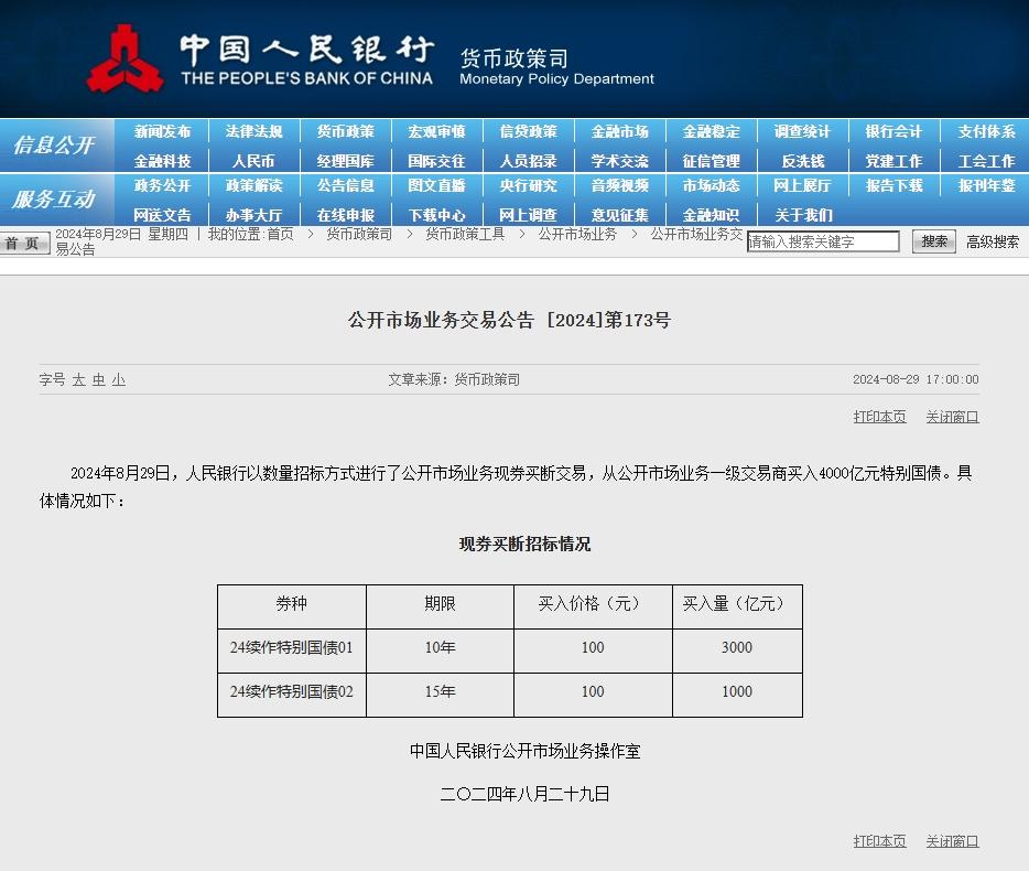 中国人民银行网站消息,8月29日,央行以数量招标方式进行了公开市场业务现券买断交易,从公开市场业务一级交易商买入4000亿元特别国债。