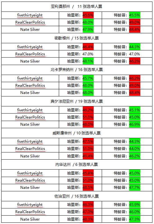 但对于拥有93张选举人票的7个摇摆州却能左右大选结果。美国多家民调公司对这7个摇摆州的民调追踪都是持续且连续的。以下是全美最具影响力的三大民调公司9月最新的追踪数据。分别为:fivethirtyeight、RealClearPolitics 和 Nate Silver。