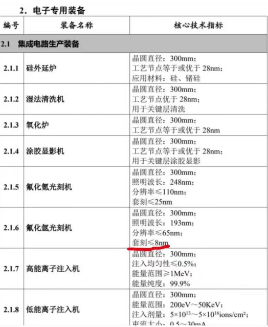 9月初,中国工信部印发《首台(套)重大技术装备推广应用指导目录(2024年版)》(以下简称《指导目录》)。在电子专用装备目录中,集成电路生产装备包括氟化氩GKJ,光源193纳米,分辨率≤65nm,套刻≤8nm。