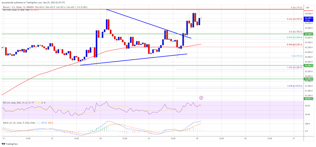 比特币价格再次突破63800美元的阻力位。如果 BTC 突破64750美元的阻力位,然后突破65000美元,则有望加速上涨。