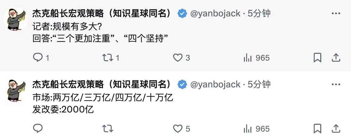发改委主任郑栅洁说,「针对当前经济运行中的新情况新问题,党中央、国务院加力推出一揽子增量政策。针对国内有效需求不足等问题,把扩内需增量政策重点更多放在惠民生、促消费上。」但是,当路透社的记者问,「这次一揽子政策有没有一个预计大概的规模?」