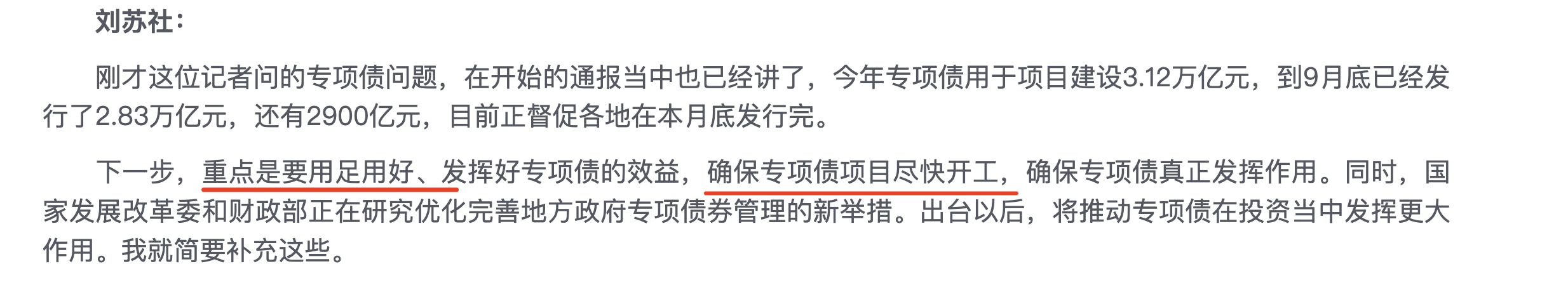 发改委刘苏社没有直接回答,而是说,「下一步,是用足用好 ,确保专项债尽快开工」