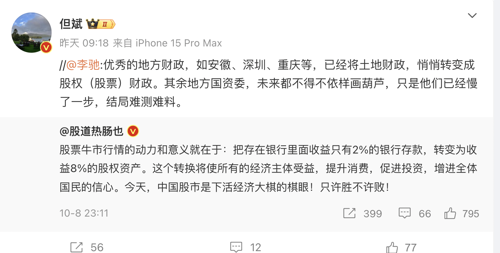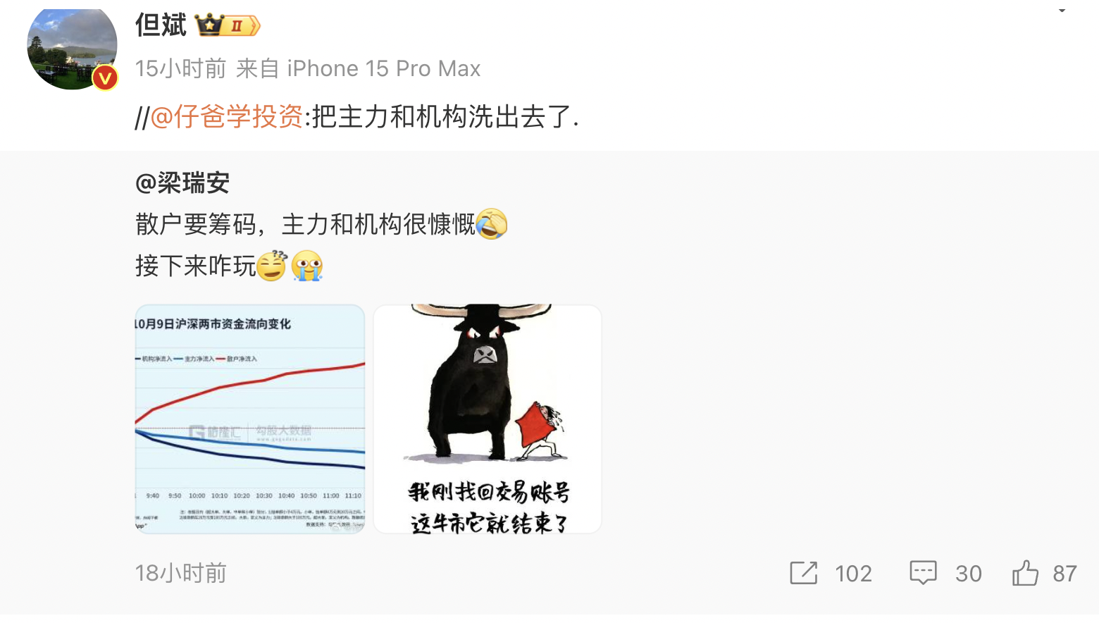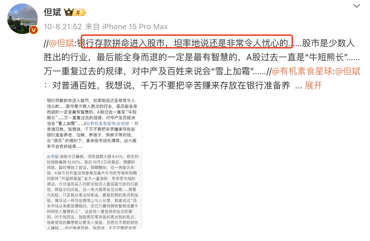 当然也有人间清醒派,让大家小心「情绪市」的但斌。但斌认为好的股市应该是慢牛,而不是政策市下的疯牛。
