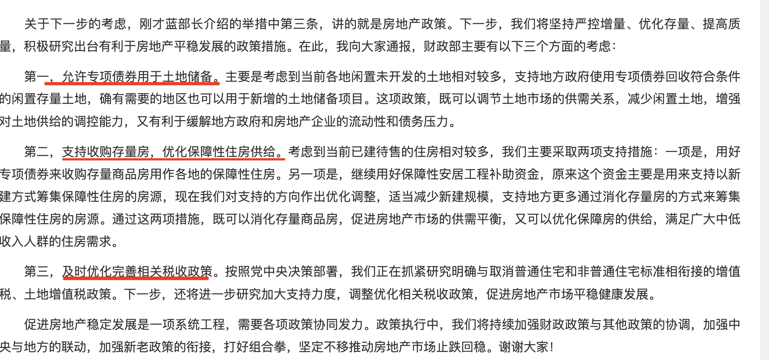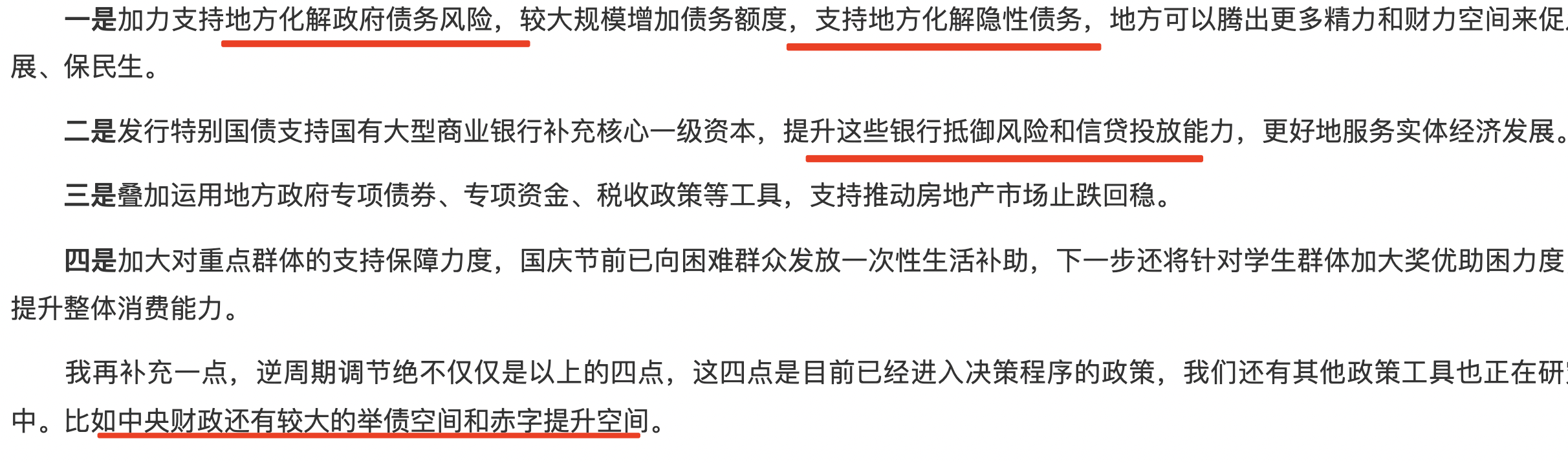 此次财政部的新闻发布会,透露的一个他们「财政增量政策」的重点放在:化债。也就是化解地方政府的债务风险。财政部部长蓝佛安说,去年置换规模超2.2万亿元。他说,即将推出「近年来力度最大」「一次性较大规模」的方案,以此推断,新措施的规模一定会在2.2万亿元之上。而且,他说,2024年以来,财政部已经安排了1.2万亿元债务限额支持地方化解存量隐性债务和消化政府拖欠企业账款。估计接下来的第四季,应该再发行特别国债至少1万亿来化债和给大型商业银行补充核心一级资本。