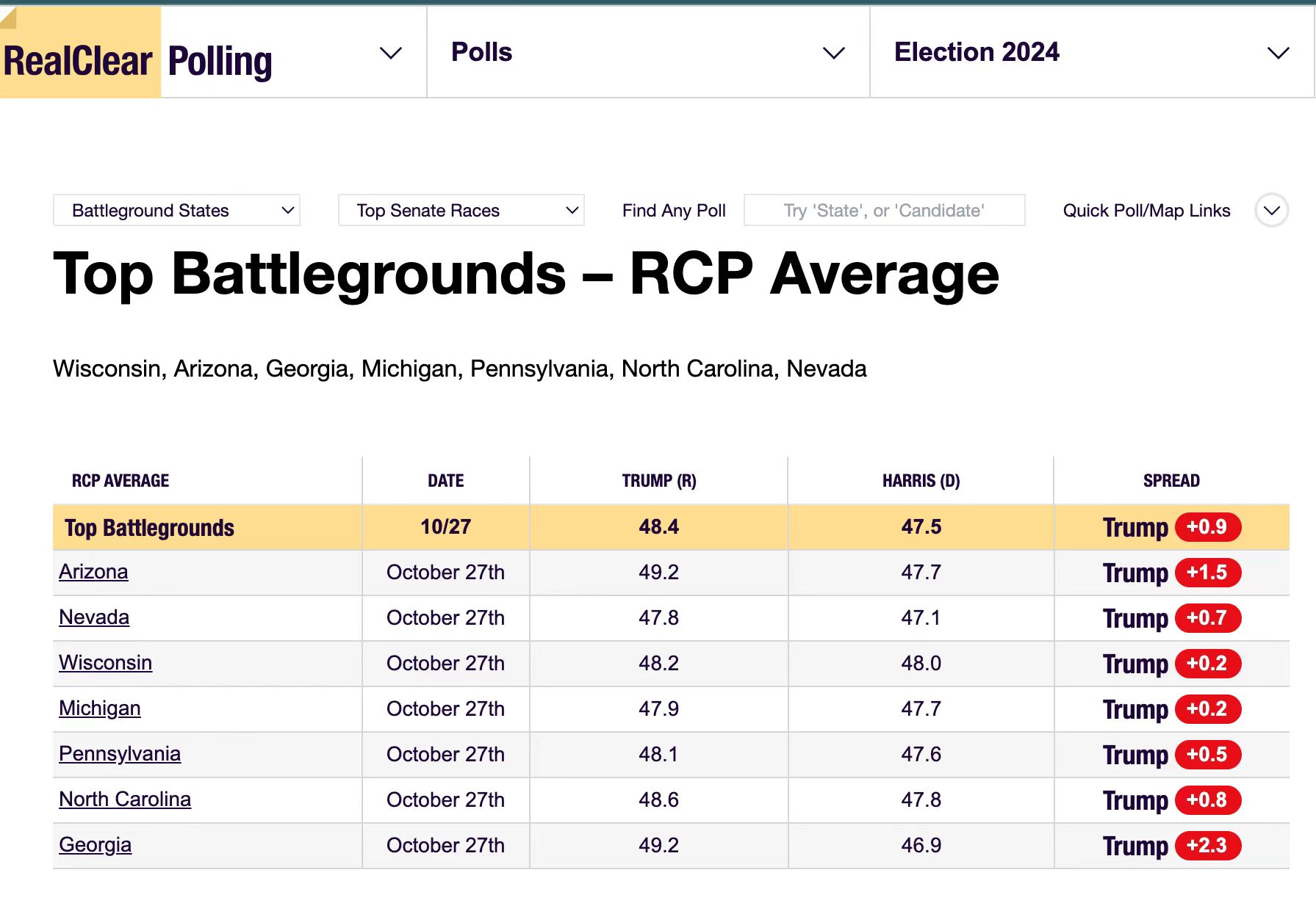 就在昨天,Real Clear Politics. 公布了最新的全国民调平均值结果。在7个摇摆州,特朗普都领先于哈里斯。但多项全国民调却显示哈里斯领先特朗普0.3-1个百分点,尽管领先的幅度都在误差范围之内。