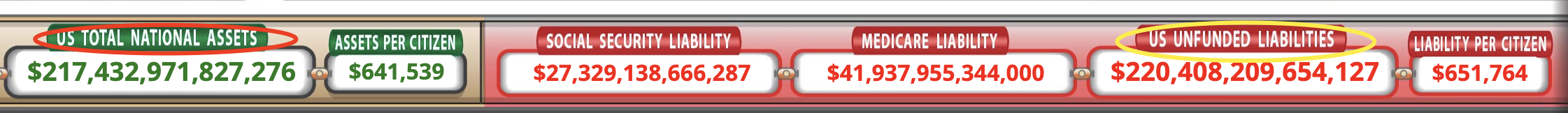 美国联邦政府未来要支付老百姓的义务(Unfunded Liabilities)还差220万亿,美国所有资产加起来(大小企业资产,家庭资产)才不过217万亿,完全资不抵债!这么大的政府承诺,如何兑现得了?