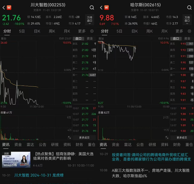 11月1日,A股市场的玄学再度显现,随着民主党候选人哈里斯的支持率出现上升,哈尔斯股票在盘中出现涨停,而近期大涨的川大智胜出现跌停。