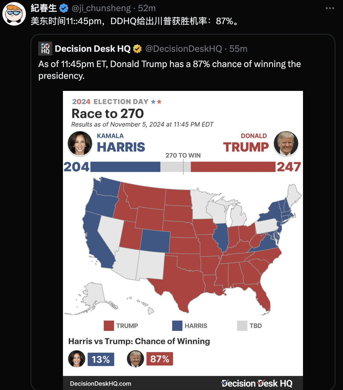 美东时间11::45pm,DDHQ给出特朗普获胜机率:87%。