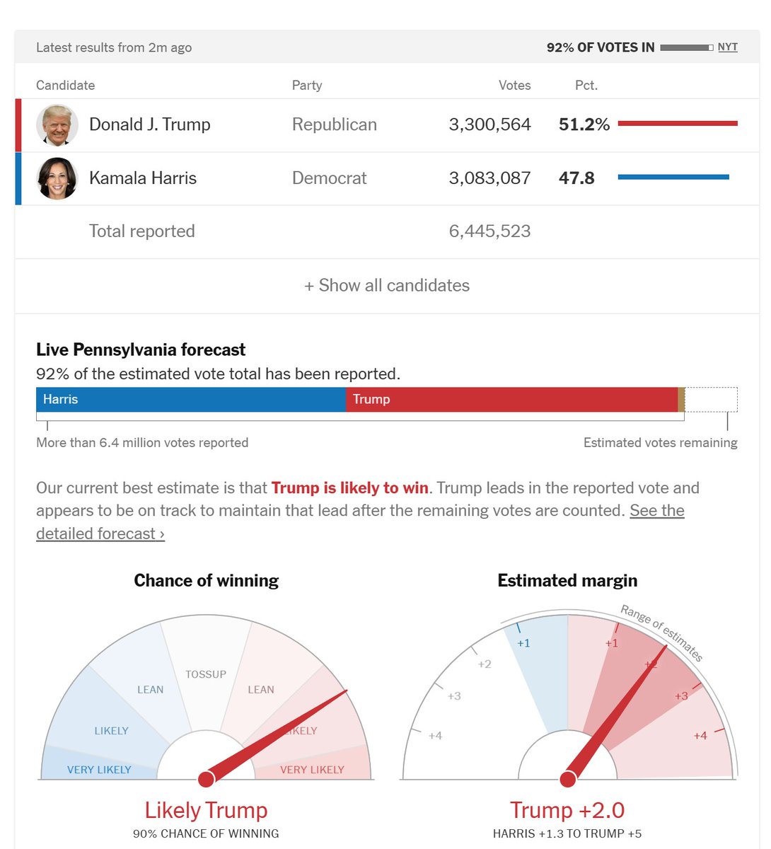 宾州票已经开了92%,特朗普的胜选的概率更高了。