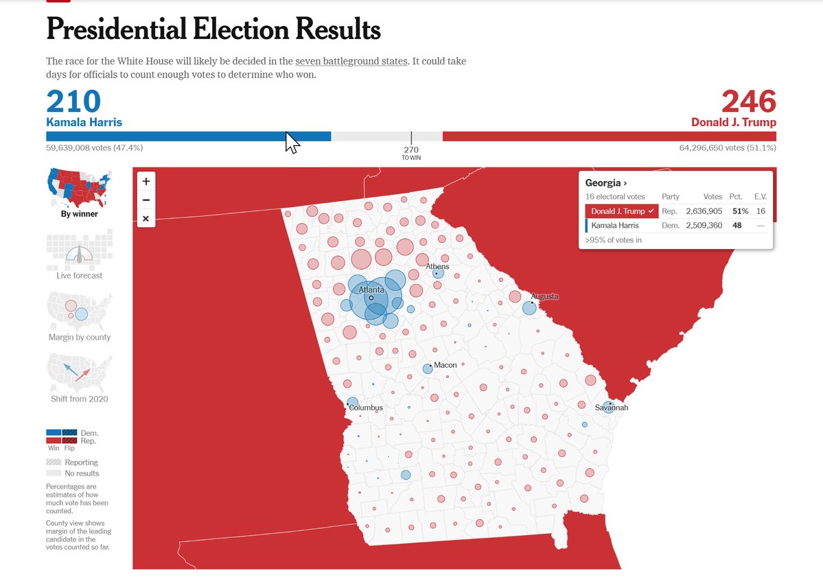 川普赢得了乔治亚州(51%比48%),使特朗普的选举人票增至246张