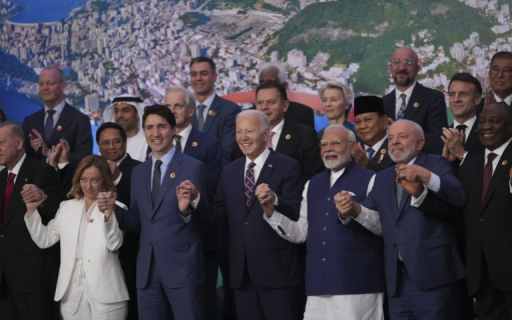 周一,在里约热内卢拍摄的“全家福”最终没有拜登和加拿大总理特鲁多的参与,尽管他们到达了正确的地点,但晚于预定的拍摄时间。