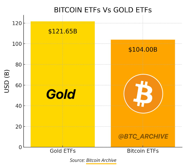 目前,BTC ETF 总共管理着约 1,040 亿美元的资金。根据 Bitcoin Archive 的数据,截至 11 月 21 日,黄金 ETF 总共管理着约 1200 亿美元的资产(AUM)。