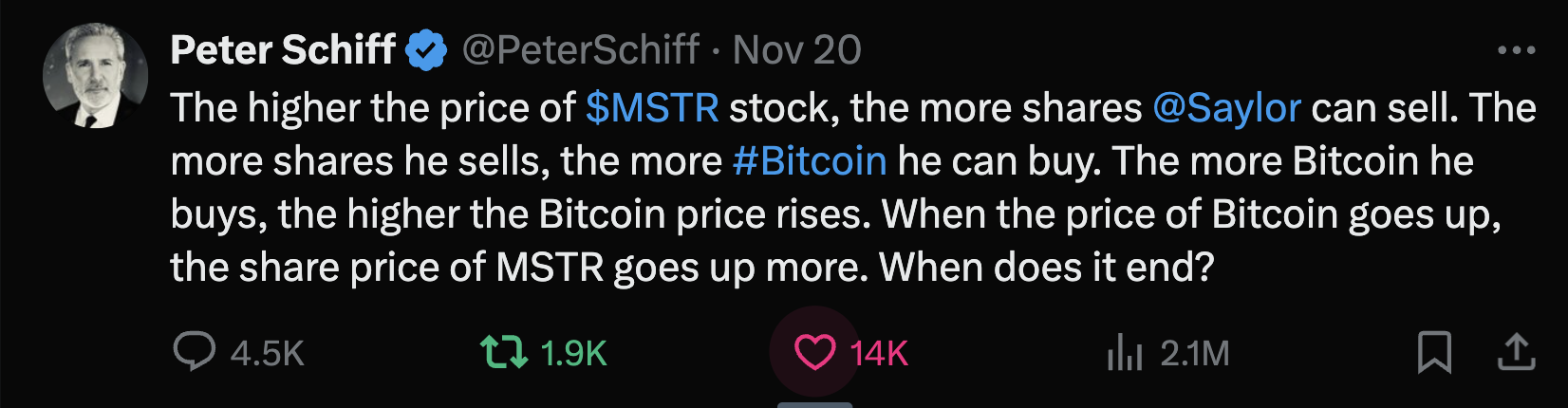 欧洲太平洋资本首席经济学家彼特·希夫(Peter Schiff )在社交媒体X上质疑这种循环策略:“微策略股价越高,塞勒可以出售的股票就越多;股票卖得越多,他购买的比特币就越多;比特币价格上涨,微策略股价上涨更多。这种循环何时结束?”