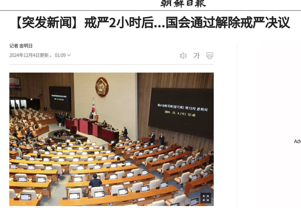 更新:戒严 2小时后,在执政党和在野党通力合作下,300名议员中的190名议员,勇敢地突破封锁,达到国会。