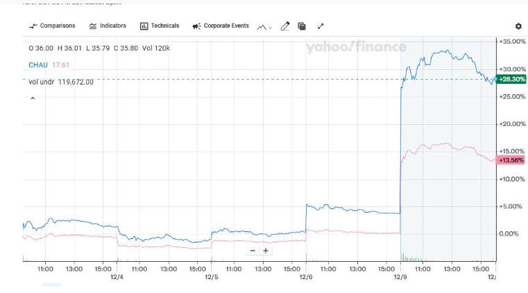 本周一,YINN 和 CHAU 的涨幅分别超过 20% 和 10%。彭博社报道称,根据计算,在周一美股早盘交易时段,上述 YINN 和 CHAU 看涨期权的每股价值分别上涨至 4.02 美元和 15.40 美元,为这些合约买方带来了约 1.38 亿美元的纸面利润。