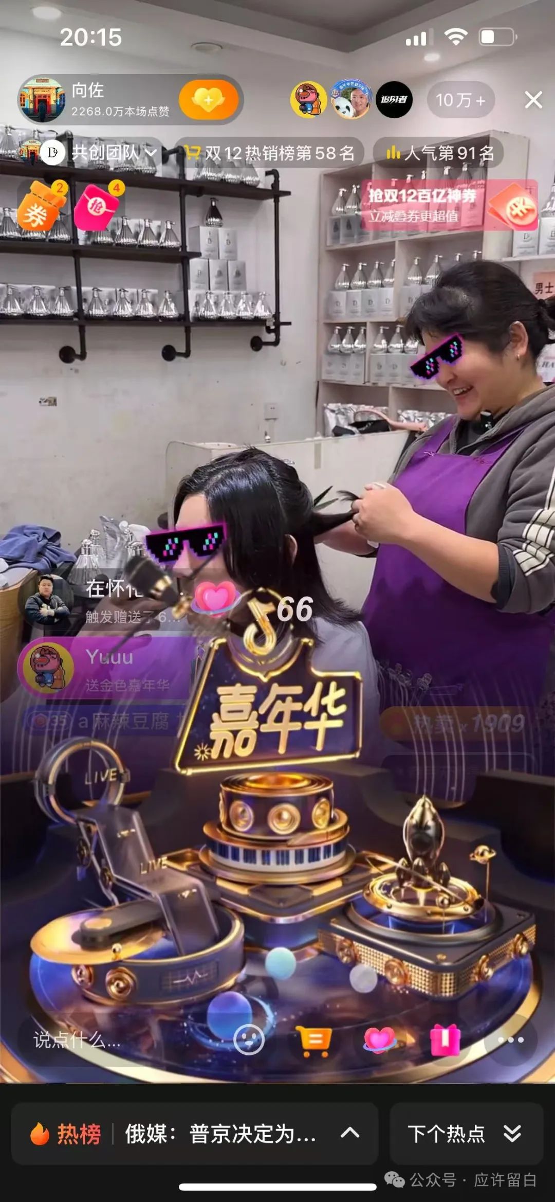 在服务业的赛道里,理发师晓华本身是一个小 V,但有了向佐的流量和话题支持,今晚居然有100万人在线看她剪向佐的头发!理发店外居然站满了整条街的人!