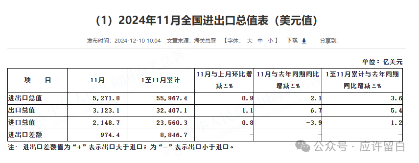 以美元计价,中国11月出口同比增长6.7%,进口同比降幅扩大至3.9%,贸易顺差较前值进一步扩大。1-11月铁矿砂、煤和天然气进口量增加,集成电路和汽车出口两位数增长。