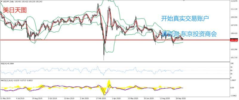 从技术分析的角度,美日汇价上日继续围绕天图级别布林带中轨处盘整,汇价前期触及前期重要支撑105.10一线后,上日记得提振,收盘于105.40一线,天图级别布林带横盘缩口,布林带中轨横盘运行。