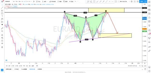 策略解析:欧澳4小时蝴蝶模式即将完成,完成区域或将出现在1.6600-1.6645,并且这个区间不仅仅是蝴蝶模式的完成点位,也是上方日线级别供给区的压制位置,因此,等待价格到位后可以博弈一波下跌回调的走势。如果稳健者,则可等待下方上升趋势线和1.6380-1.6335需求区重合位置,逢低买入欧澳,因为欧澳在月线和周线级别上,已开始慢慢出现大级别筑底迹象,中长线趋势或将反转开启上行。