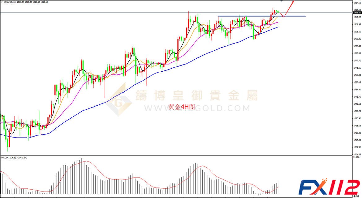 黄金昨日早间开盘后小幅下跌,在跌至4H周期MA20均线附近受到支撑,随后一路上行,最高涨至1820附近。从4H周期走势结构看,黄金昨日突破1814附近阻力,均线指标呈向上发散状态,后市大概率延续上涨。结合1H周期指标看,黄金走出三波上行结构,多头力量暂无放缓迹象,下方1814位置已由压力转为支撑,日内回落至此可尝试布局多单,目标上看1830附近。