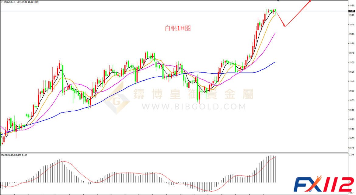 白银昨日早间开盘后小幅下跌,在跌至1H周期MA60均线附近受到支撑,随后一路上行,最高涨至19.91附近。从1H周期走势结构看,白银昨日强势上攻,均线指标呈向上发散状态,后市大概率延续上涨。但需要注意的是白银由于涨势过大,目前价格和均线指标乖离率过大,短线有回调需求。强势行情中通常回调比例较小,回调至昨日上涨段黄金分割线0.382位置19.65附近可尝试多单,目标上看20.00附近。