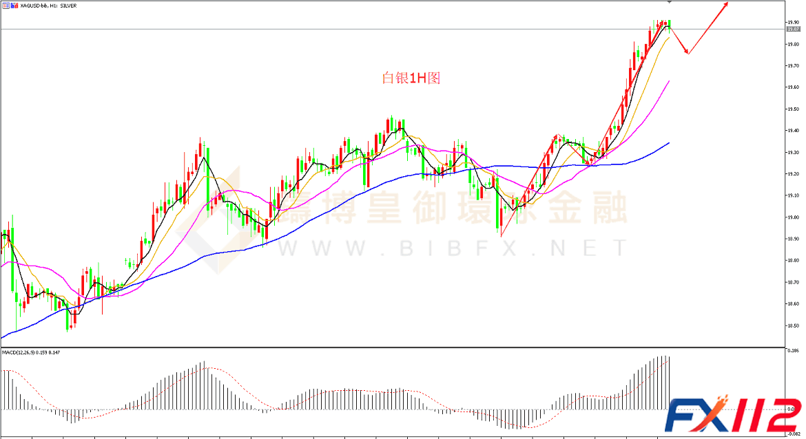 白银昨日早间开盘后小幅下跌,在跌至1H周期MA60均线附近受到支撑,随后一路上行,最高涨至19.91附近。从1H周期走势结构看,白银昨日强势上攻,均线指标呈向上发散状态,后市大概率延续上涨。但需要注意的是白银由于涨势过大,目前价格和均线指标乖离率过大,短线有回调需求。强势行情中通常回调比例较小,回调至昨日上涨段黄金分割线0.382位置19.65附近可尝试多单,目标上看20.00附近。