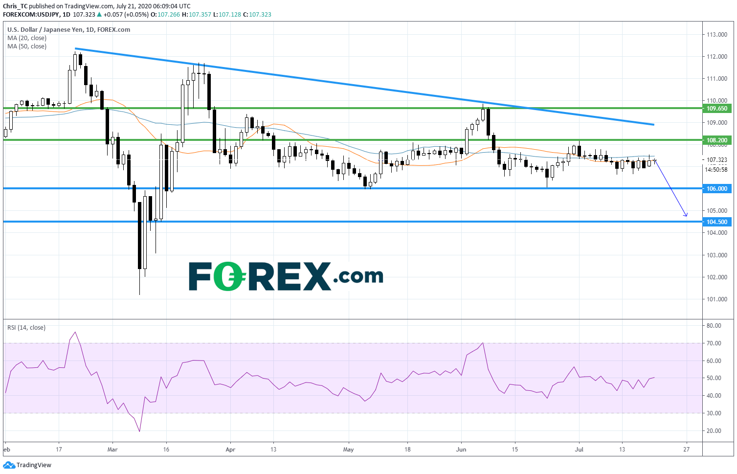技术面角度来看,日线图上,美元/日元封顶于一条下降趋势线,并落在50日均线 (蓝线)下方。因此,读者可能会考虑水平阻力108.20下方进一步走低潜力,因为最近的支撑位在6月底部106.00,第二个支撑在水平支撑位104.50。