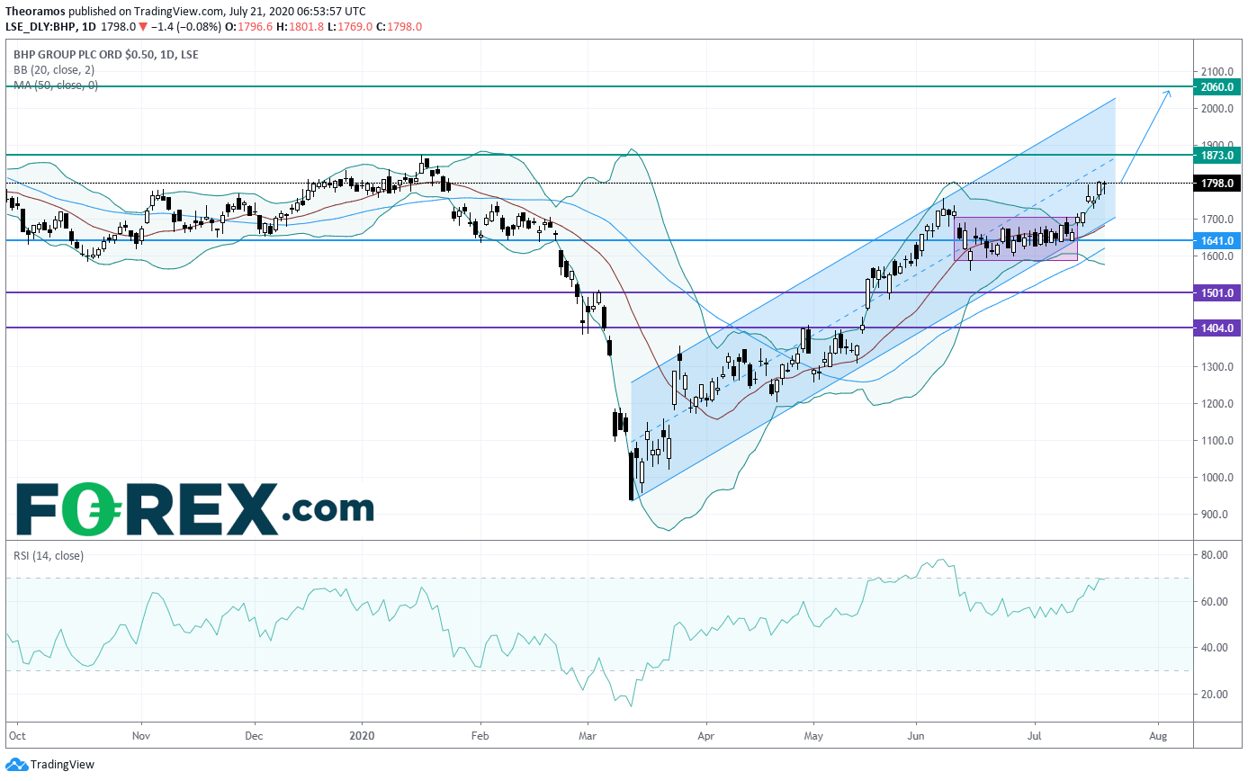 技术面角度看,自3月以来,该股处于看涨通道内,并已脱离短线横向整固区域。此外,20日均线正在发挥支撑作用。1641便士上方,或进一步攻向2019年8月水平阻力,即1873便士和2060便士价位。