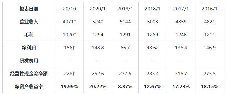 财务数据方面,2016年到2020年,其营业收入从4821亿美元上升至5240亿美元;净利润从146.9上升至148.8亿美元,期间营业收入上升了8.69%,利润上升了1.29%,这表明在最近几年里其业绩一直保持稳定。另外,其经营性现金流净额一直是远大于其利润的,这也表明其业务仍很赚钱。另外,从2020年前三个季度来看,销售额为4071亿美元,同比上升6.48%。净利润为156亿美元,同比上升45.26%。经营性现金流净额也同比上升,整体表现非常不错。