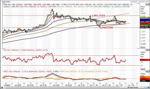 美国昨公布1月制造业供应管理协会指数较预期放缓,亦差过预期。消息指美国总统拜登将与10位中间派共和党参议员协商,商讨将原先19000亿刺激经济方案金额下调,务求令方案较易通过。美元受消息刺激上升,曾上穿91水平后回落。现货黄金则受白银价格上升影响而同步得到提振,价格重越1860美元关口。