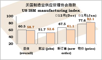 美国1月制造业供应管理协会指数报58.7,从12月的60.5放缓,程度差过预测的60.0,但仍然是强固扩张水平。支持制造业扩张的是商品需求强劲,在家工作驱动电子产品及家具升23.7%,但耐用制造商品需求连续两个月下跌。反映短期前景的新订单指数跌6.4点至61.1,出口订单也有所减慢,意味制造业活动可能进一步放缓。亮点是就业改善,指数从51.7升至52.6。担心通胀的得到一些支持,原材料及投入价格升至接近10年以来最高。物价分项指数意外上升,从77.6升至82.1,2011年以来最高,预测是回落至77.0。
