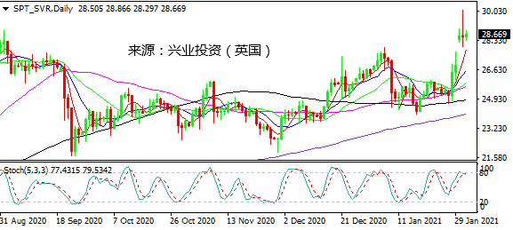 美元指数周一自欧洲盘开始强势拉升,一举突破91关口阻力,强势特征明显。非美货币中,欧系货币明显走弱,因欧盟地区新冠疫苗接种可能延迟,恐拖累经济复苏。商品货币中,加元回吐早前一日涨幅,而澳元和纽元接近收平。白银继续遭到美国散户狙击大幅飙升,一度上探30,为8年来首次,但在美元强势下基本回吐当天涨幅,黄金受到推动再度上探1870一线,出现冲高回落行情,这波由散户带动的行情,可能难以持续。