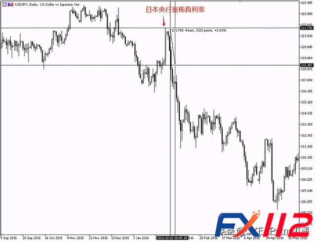 实行负利率就代表货币贬值吗?非也。以日本央行和日元为例,2016年1月29日,日本央行超出市场预期的宣布实施负利率。回看当时货币市场对于该消息的反应似乎十分纠结。在宣布当日,日元贬值超330余点,但随后日元便开启了长达4个月的升值趋势,美元兑日元一路从121.7一带开始下跌,最低至98.935一带。