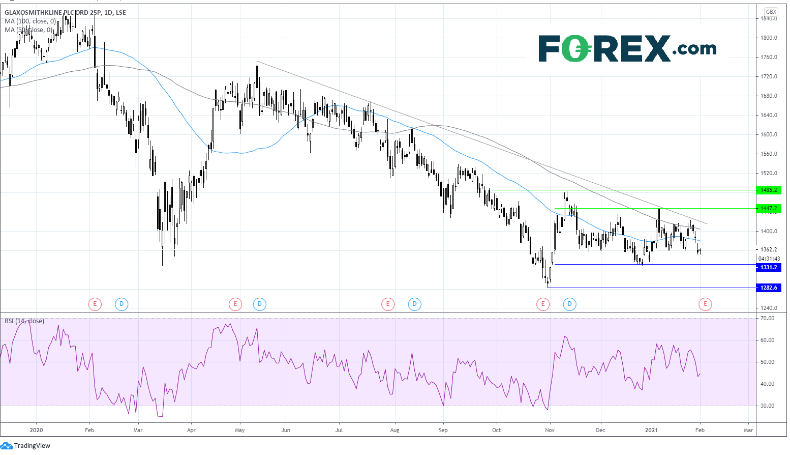葛兰素史克股价在整个2020年都趋于下跌,目前交投于5月初以来的下降趋势线,也低于其50与100天均线,表明当前趋势看跌。