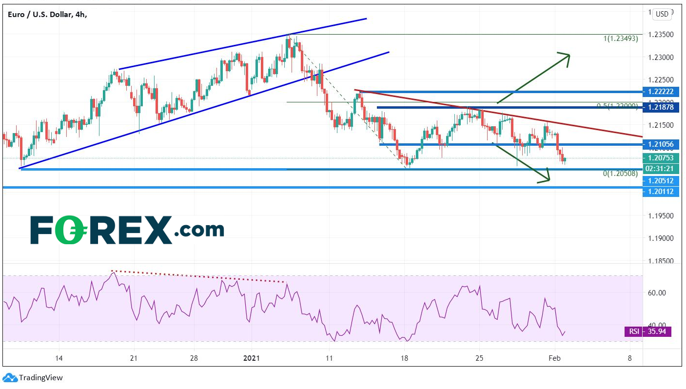 切换到4小时图,可以更加清楚地看到欧元/美元1月8日以来所在的交投区间。与美元指数相背的是,欧元/美元的高点下降并连成一条下降趋势线(请看红色线,目前落在1.2150附近),空头可能在反弹至该趋势线时择机沽售。如果站于其上,欧元/美元有望回到近期高点1.2190附近。