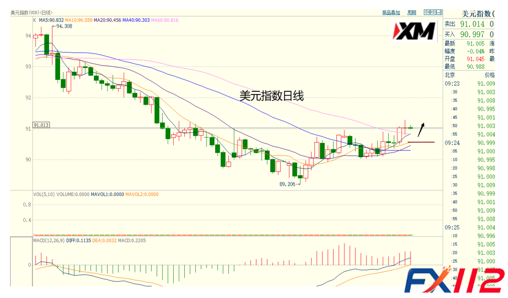 美元回踩可关注90.80附近低多机会,目标91.10-91.30。
