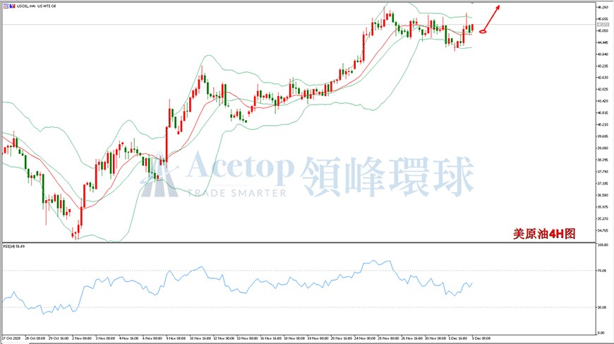 美原油四小时图形上看,油价昨日突破四小时布林带中轨,行情由弱转强,日内有望继续上行;从RSI指标上看,RSI拐头向上,是多头信号;从日线图形上看,RSI尚未出现背离信号,油价在日线布林带中轨上方运行,也预示后市有较大的概率延续多头走势。建议日内投资者采取做多的思路进行操作,多单入场参考44.90区间,该区间有重要支撑。